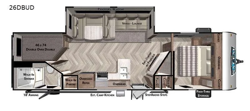 Here is the new 2023 Salem 26DBUD. this is the perfect family travel trailer, with double bunks at one end and a queen bedroom at the other. in the main living area you have a flat screen tv, entertainment center with stereo, usb and bluetooth connection, and a fireplace that is both functional and esthetic. the kitchen has a oversized refrigerator with freezer, a large pantry, the U shaped dinette that is perfect for eating and game time, and the customizable versa-lounge with plenty of storage. Choose this new Salem travel trailer and let everyday life take a backseat so you can relax and unwind for awhile.